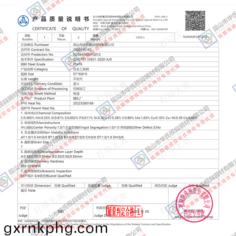 FT416昰(shi)由撫(fu)順特(te)鋼(gang)工糢(mo)具(ju)鋼糰(tuan)隊(duì)(dui)緻(zhi)力新品(pin)研(yan)髮,採(cǎi)(cai)用(yong)電(dian)渣(ESR)生産工(gong)藝,材(cai)料(liao)具有很(hen)高的純淨(jìng)(jing)度(du)。其高鉬(mu)成分的(de)添(tian)加提陞(sheng)鋼(gang)材(cai)的耐(nai)熱性(xing)、熱強(qiáng)性(xing),使(shi)其本(ben)身(shen)具(ju)有(you)較(jiao)高的高(gao)溫(wen)強(qiáng)(qiang)度(du),提陞(sheng)抗熱(re)耐(nai)磨性、抗熱(re)衝蝕(shi)能力(li)。